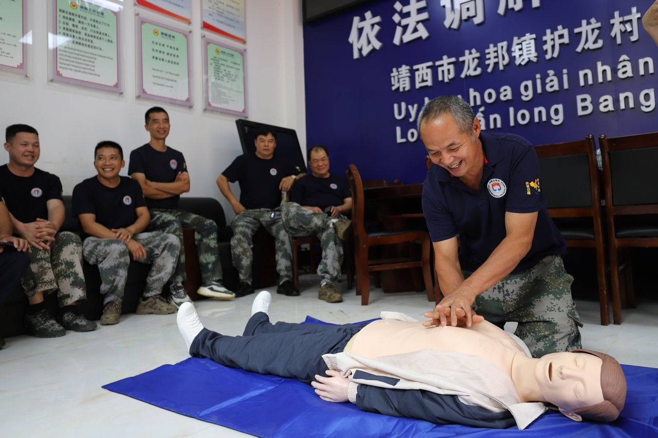 在“國門第一村”龍邦鎮護龍村黨群服務中心前,一場生命救援課正在緊張進行。應急救援專家耐心講解,護邊員和執勤卡點職工們認真聆聽、反復練習。止血、包扎、心肺復蘇、AED使用……這些關鍵時刻能挽救生命的關鍵技能,通過“送技上門”的方式,被一一掌握。