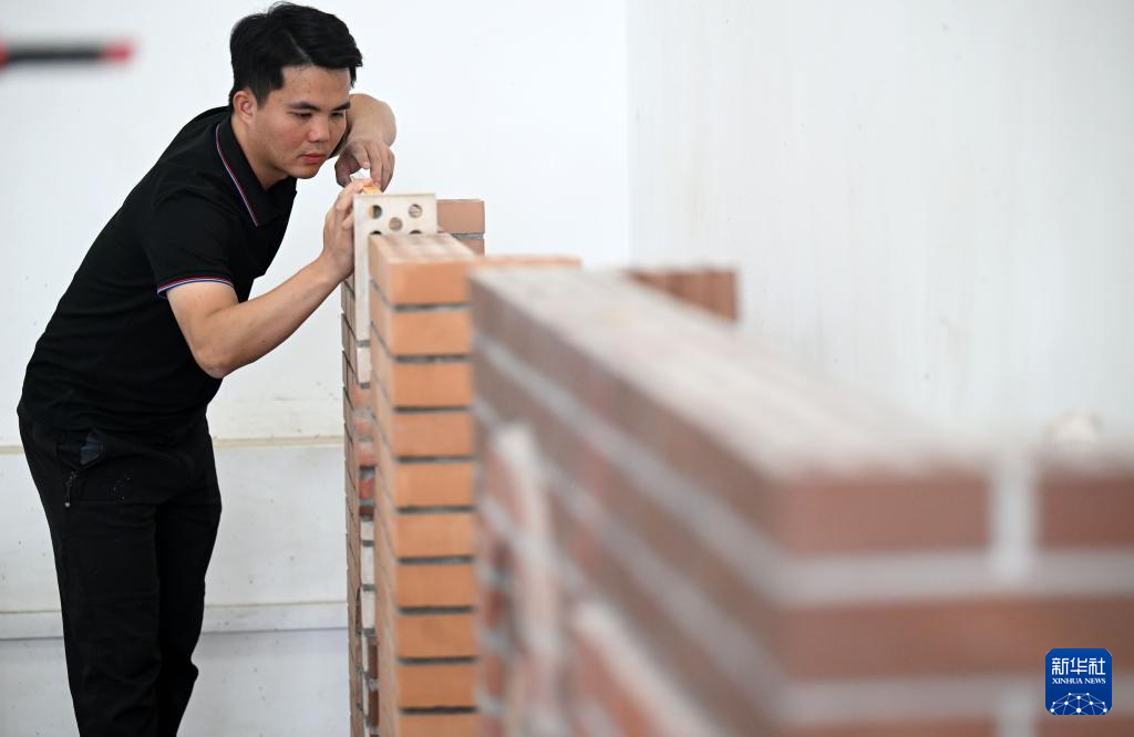 9月9日,在天津鐵道職業(yè)技術(shù)學(xué)院砌筑集訓(xùn)基地,伍遠(yuǎn)州對(duì)墻體進(jìn)行測量。新華社記者 趙子碩 攝