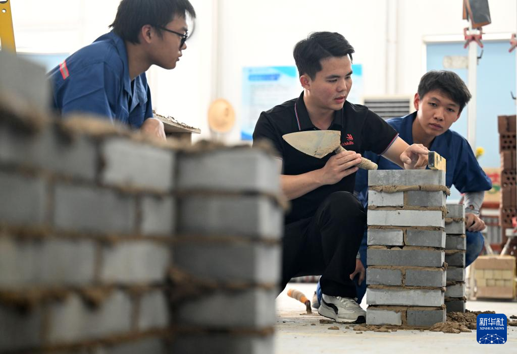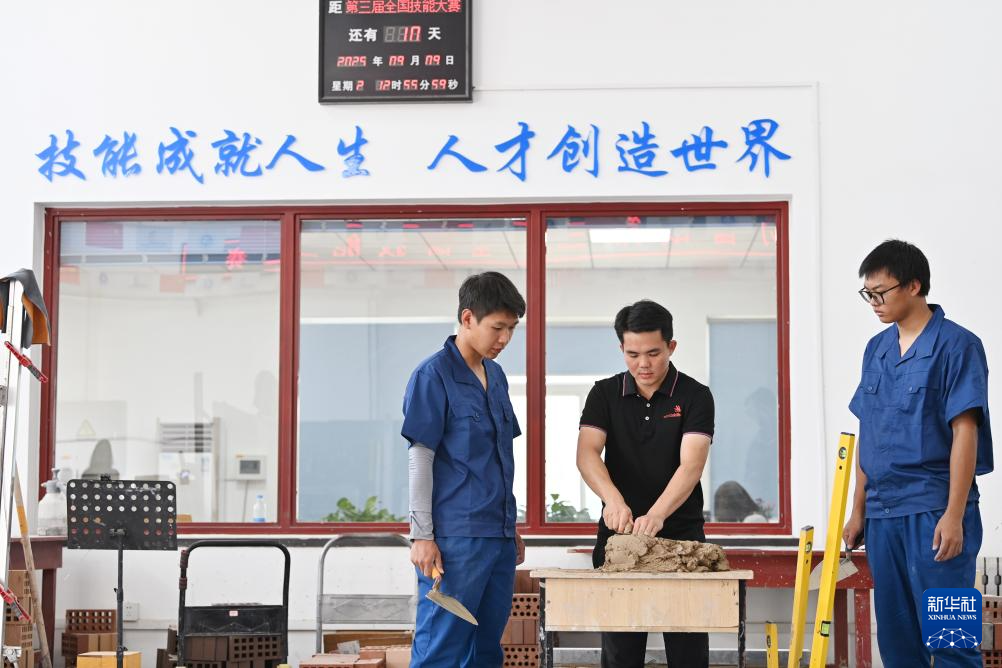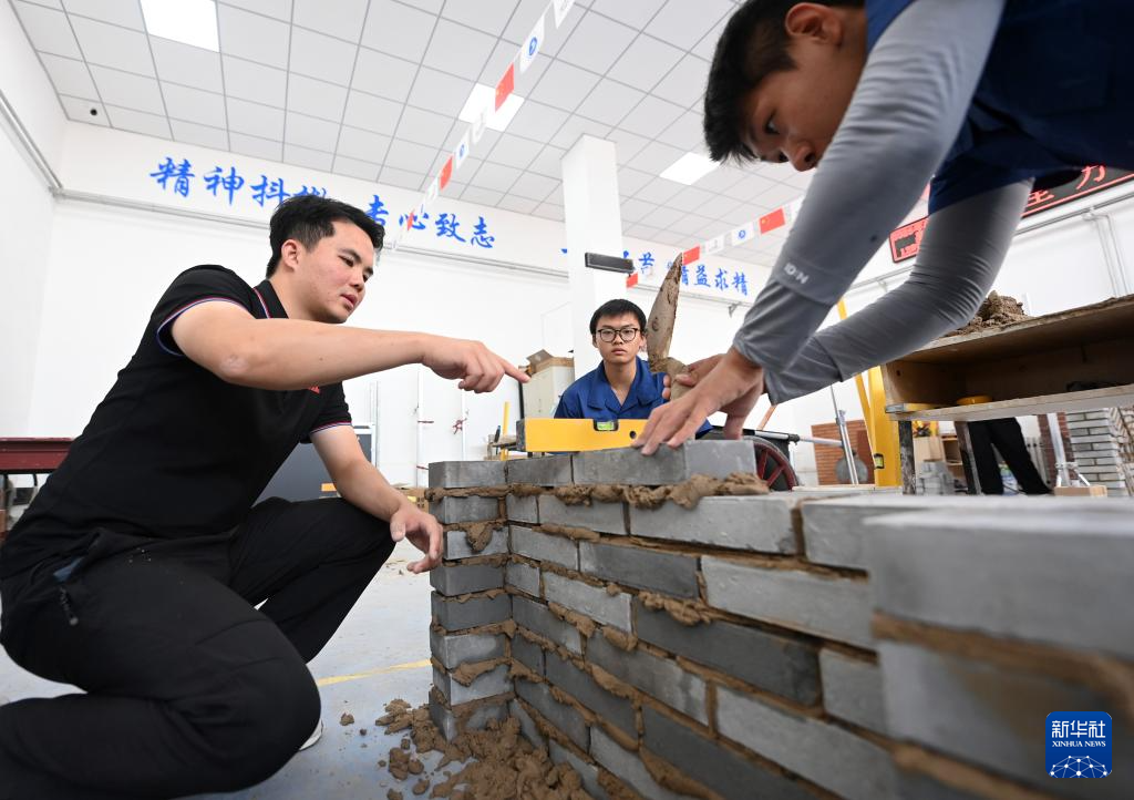 9月9日,在天津鐵道職業(yè)技術(shù)學(xué)院砌筑集訓(xùn)基地,伍遠(yuǎn)州指導(dǎo)學(xué)生實(shí)踐。新華社記者 趙子碩 攝