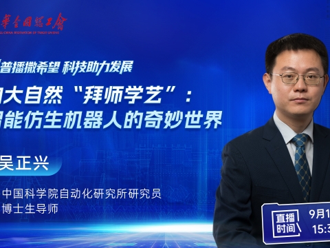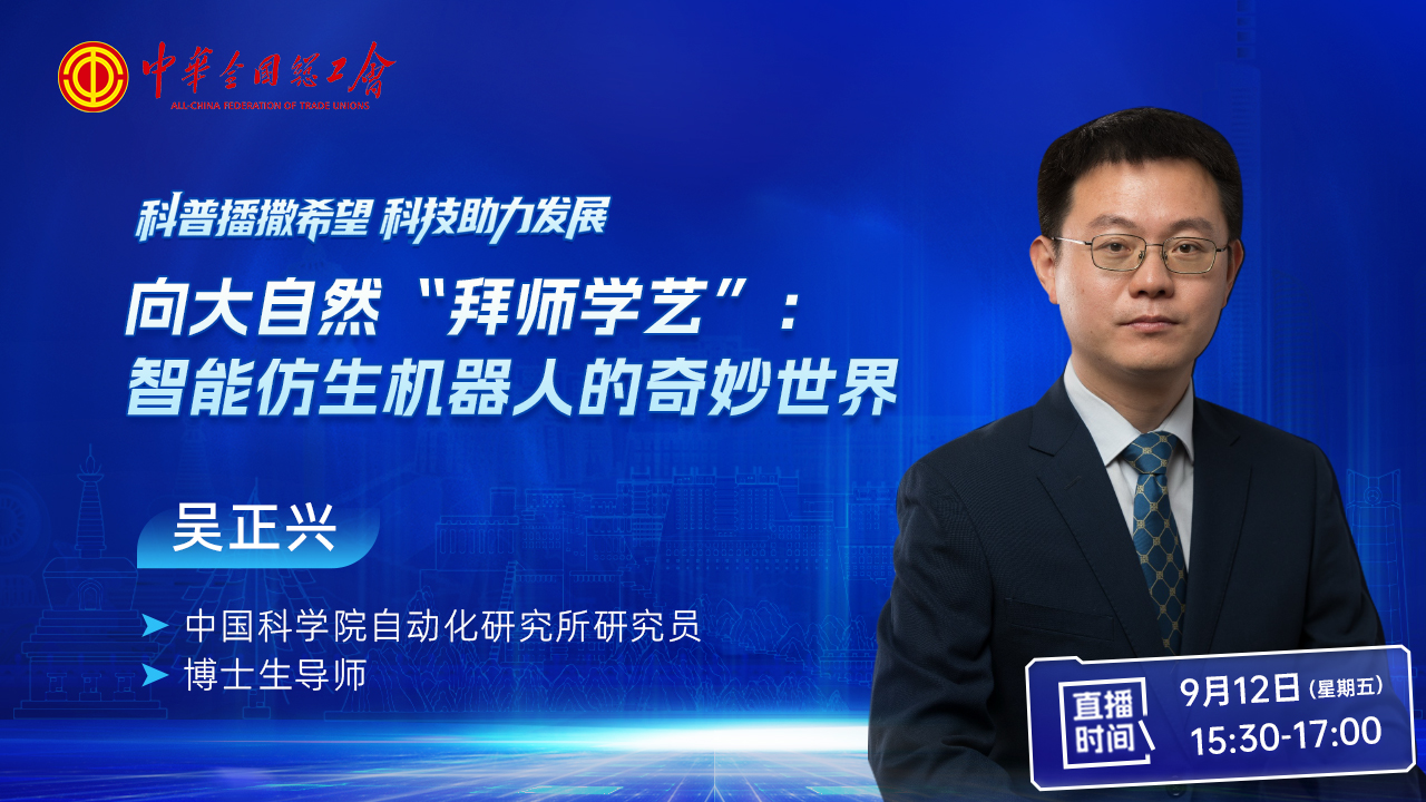直播回顧|“科普播撒希望 科技助力發展”工會服務職工活動:向大自然“拜師學藝”——智能仿生機器人的奇妙世界??????為深入貫徹落實黨中央關于對口支援西藏工作的重大決策部署,在助力地區高質量發展和鄉村振興中充分發揮工會組織的橋梁紐帶作用,中國教科文衛體工會、中國科學院工會在西藏自治區林芝市、日喀則市舉辦“科普播撒希望 科技助力發展”工會服務職工活動。6場精彩的科普講座敬請關注!本場科普講座專家——吳正興,中國科學院自動化研究所研究員、博士生導師。生物經過億萬年自然進化,形成了與生存環境高度適配的形態結構、運動方式及行為機制,為人類發明創新提供了重要參考。近年來,智能機器人發展迅速,研究人員希望通過師法自然,仿生自然,繼續推動該領域理論與技術革新。本報告聚焦智能仿生機器人系統:先從仿生學視角,結合生活中豐富的仿生實例,闡釋仿生學對人類科技發展的啟迪及研究價值;再詳細介紹人形、足式、游動、撲翼機器人等典型系統;最后展望該領域未來發展趨勢。9月12日(星期五)15:30—17:00中工網首頁、微博、視頻號同步播出。