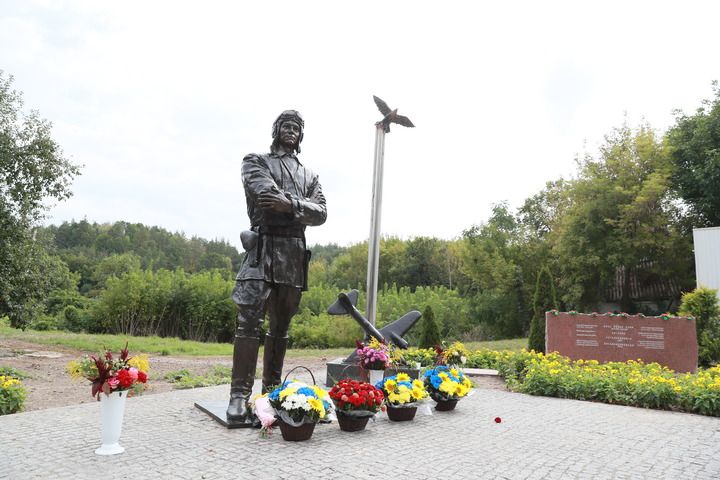 烏克蘭第聶伯河沿岸,秋日的陽光灑在庫里申科學校對面的廣場上。身著飛行服的蘇聯空軍志愿隊重型轟炸機大隊少校大隊長庫里申科的雕塑目視遠方,在他身邊,一只銅制“蘇聯雄鷹”展翅翱翔。