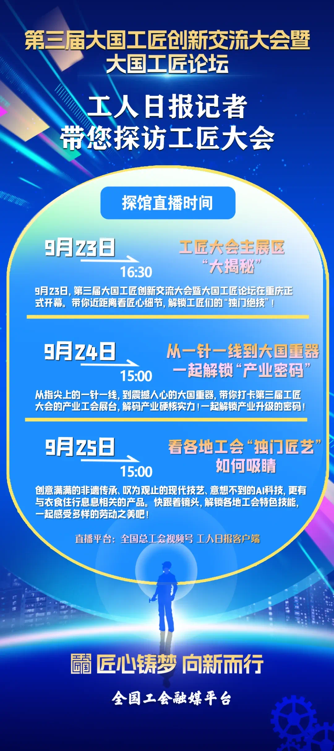 從指尖上的一針一線,到震撼人心的大國重器,一起來打卡第三屆工匠大會的產(chǎn)業(yè)工會展臺,解碼產(chǎn)業(yè)硬核實(shí)力!在這里,你不僅能看到產(chǎn)業(yè)工人用匠心打磨的精致器件,還能見識到高端裝備的制造奧秘。跟著直播鏡頭,一起解鎖產(chǎn)業(yè)升級的密碼!