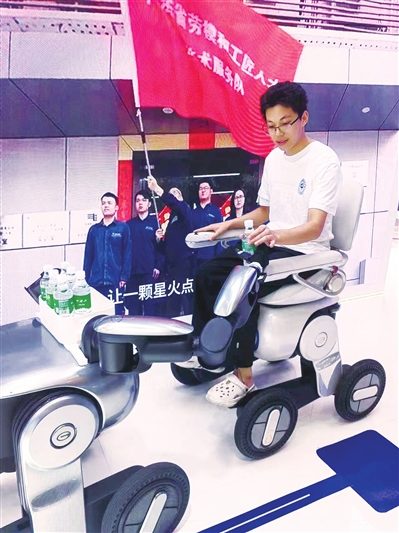 一位觀眾坐在載人輪足機(jī)器人上,另一旁的具身智能服務(wù)機(jī)器人為他遞來一瓶水。南方工報(bào)全媒體記者黃細(xì)英 攝