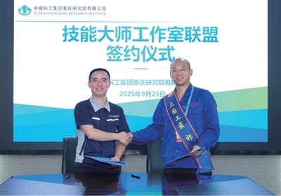 9月25日,大國(guó)工匠祁峰(右一)與中煤科工集團(tuán)重慶研究院有限公司簽訂技能大師工作室聯(lián)盟合作協(xié)議。