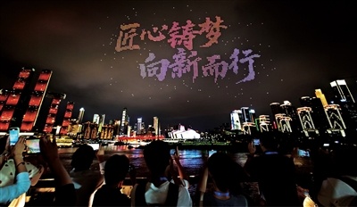 9月22日,5000架無(wú)人機(jī)點(diǎn)亮重慶夜空,以瑰麗燈光秀向大國(guó)工匠致敬。