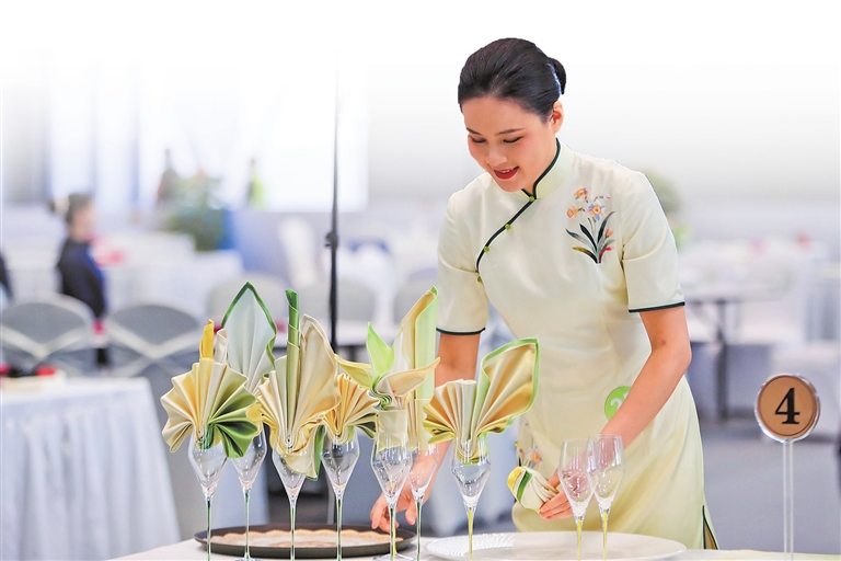 9月21日,參賽選手在餐廳服務(wù)項(xiàng)目比賽中。