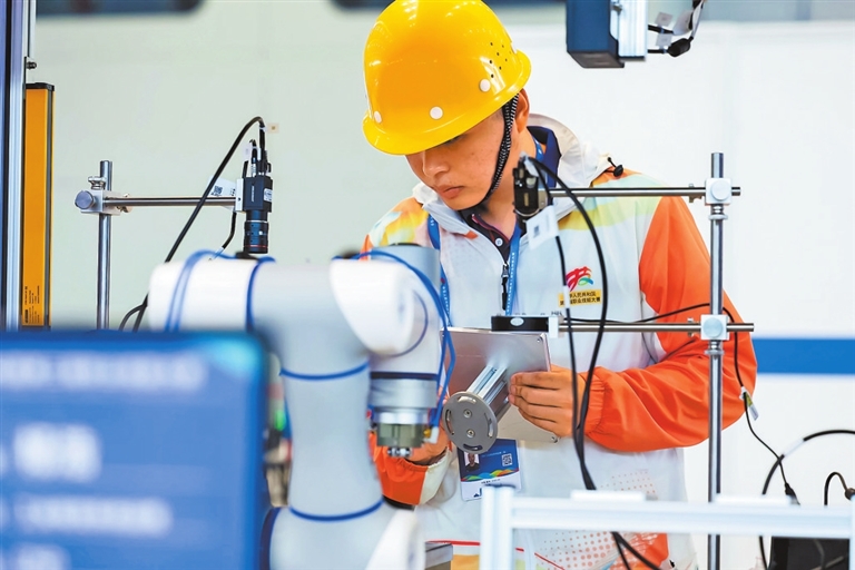 9月21日,工業(yè)視覺(jué)系統(tǒng)運(yùn)維項(xiàng)目的參賽選手正在調(diào)試設(shè)備。