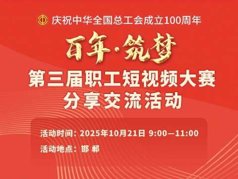 直播回顧|“百年·筑夢”第三屆職工短視頻大賽分享交流活動??????10月21日(周二)上午9:00至11:00,由中華全國總工會宣傳教育部、網絡工作部指導,工人日報社、中工網聯合主辦,河北省邯鄲市總工會承辦的“百年·筑夢”第三屆職工短視頻大賽分享交流活動,在河北省邯鄲市開啟線上直播。獲獎代表、職工短視頻達人等嘉賓與大家交流創作心得,并邀請專家進行現場點評。人民日報視頻客戶端“視界”,全國總工會視頻號、抖音號,工人日報視頻號、抖音號,中工網PC端、視頻號、抖音號等平臺同步直播。歡迎廣大職工觀看直播,共赴這場屬于職工的視聽盛宴!
