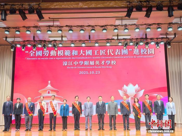 10月23日,中華全國(guó)總工會(huì)組織的“全國(guó)勞動(dòng)模范和大國(guó)工匠代表團(tuán)”抵達(dá)澳門展開訪問(wèn)行程。圖為當(dāng)日下午,代表團(tuán)走進(jìn)澳門濠江中學(xué)附屬英才學(xué)校,與師生面對(duì)面互動(dòng)。中新網(wǎng)記者 鄭嘉偉 攝