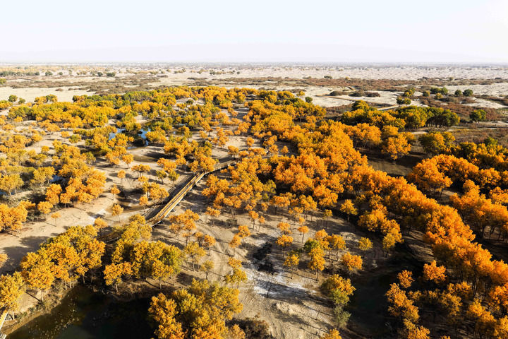 這是2025年10月19日拍攝的新疆和田地區洛浦縣洛濱胡楊林景區風光(無人機照片)。新華社記者 辛悅衛 攝