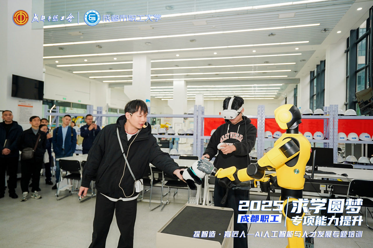 11月12日,由成都市總工會主辦、成都市工會干部學校(成都市職工大學)承辦的2025年度成都職工“求學圓夢”學歷素質提升計劃專項能力提升系列培訓在成都機器人創新中心正式拉開帷幕。首場培訓以“探智造·育匠人——AI人工智能與人才發展”為主題,吸引了“求學圓夢”計劃在讀勞模工匠學員代表等60余人參與。培訓活動通過線上網絡直播+實景研學體驗+線下授課研討形式開展,助力學員把握人工智能發展脈搏,實現能力躍升。