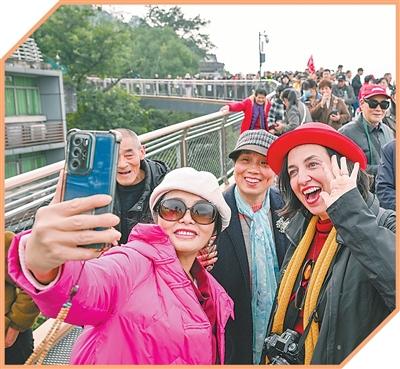 外國游客在重慶半山崖線鵝嶺棧橋與市民合影。新華社記者 陳誠攝