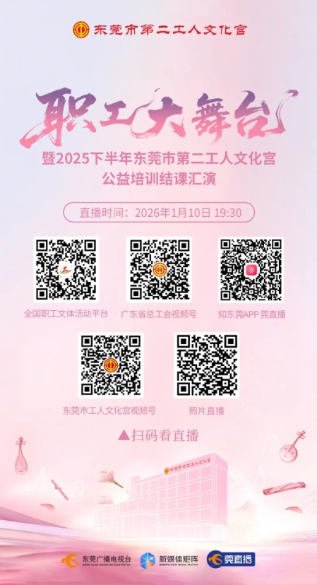 “職工大舞臺”暨2025下半年東莞市第二工人文化宮公益培訓結課匯演即將啟幕。近60項課程,超萬名職工學員經過層層打磨,最終遴選13個精品節(jié)目,共500余名職工登上舞臺一一既有優(yōu)雅的中國舞,也有高亢的合唱,悠揚的傳統(tǒng)器樂演奏,全方位展示新時代東莞職工的精神面貌。
