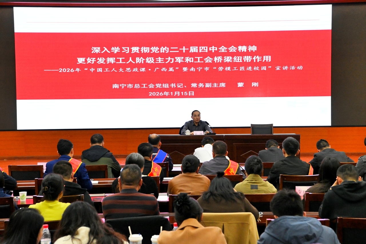 1月15日,廣西南寧市總工會(huì)在南寧職業(yè)技術(shù)大學(xué)舉辦2026年“中國(guó)工人大思政課·廣西篇”暨南寧市“勞模工匠進(jìn)校園”宣講活動(dòng)。南寧市總工會(huì)黨組書(shū)記、常務(wù)副主席蒙剛出席開(kāi)班儀式,并面向全市各級(jí)勞模工匠、職工代表及師生代表,專(zhuān)題宣講黨的二十屆四中全會(huì)精神。