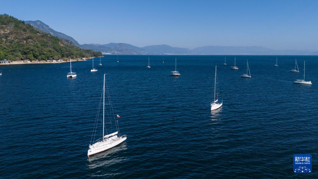 1月27日,游客在云南省玉溪市撫仙湖劃船游玩(無人機照片)。新華社記者 高詠薇 攝