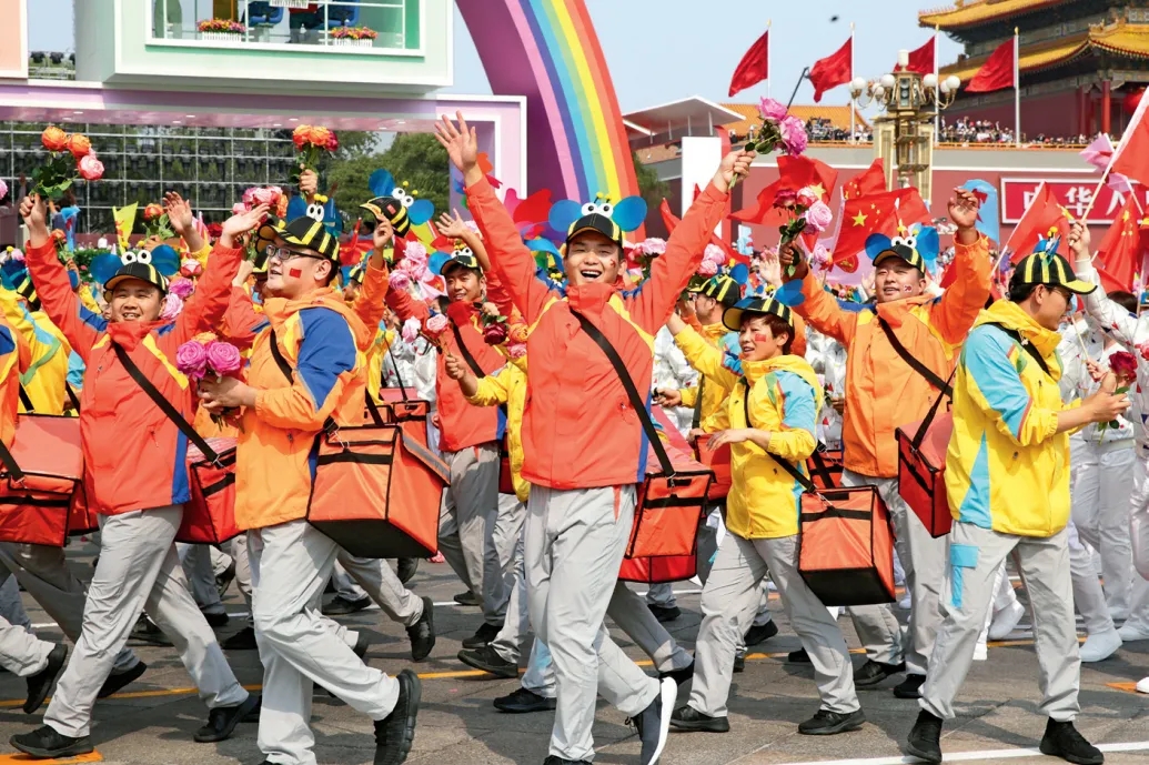2019年10月1日上午,慶祝中華人民共和國(guó)成立70周年大會(huì)在北京天安門廣場(chǎng)隆重舉行。這是快遞小哥所在的“美好生活”方陣。
