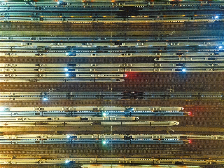 2月1日凌晨,中國鐵路鄭州局集團有限公司鄭州動車段停車場內,一列列完成當日運營任務的動車組陸續返回。