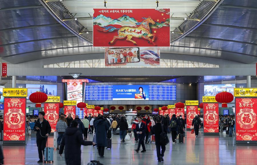 走進天津站候車廳,撲面而來的是一股熱鬧勁兒。大紅燈籠、大型中國結高懸各處,電子屏持續滾動馬年春節主題圖片,濃厚的過年氛圍感染著每一位往來旅客。