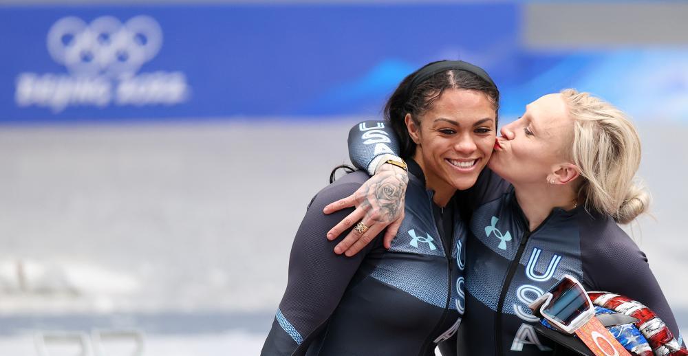 2022年2月19日,美國選手凱莉·漢弗萊斯(右)和隊友凱莎·洛夫在北京冬奧會女子雙人雪車比賽后。新華社記者 姚劍鋒 攝