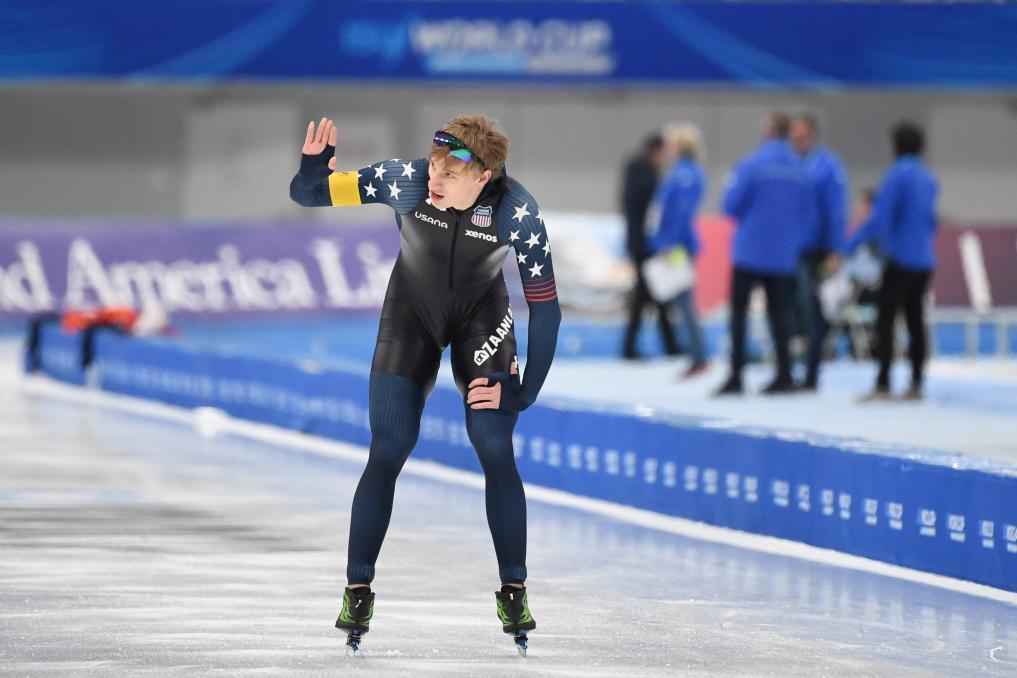 2024年12月1日,斯托爾茲在國際滑聯速度滑冰世界杯北京站男子500米奪冠后向觀眾致意。新華社記者 鞠煥宗 攝