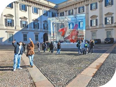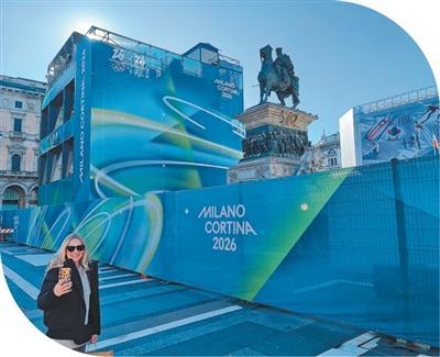 在米蘭市中心的大教堂廣場(chǎng)上,當(dāng)?shù)厥忻裨趭W運(yùn)宣傳展板前自拍。人民日?qǐng)?bào)記者 謝亞宏 攝