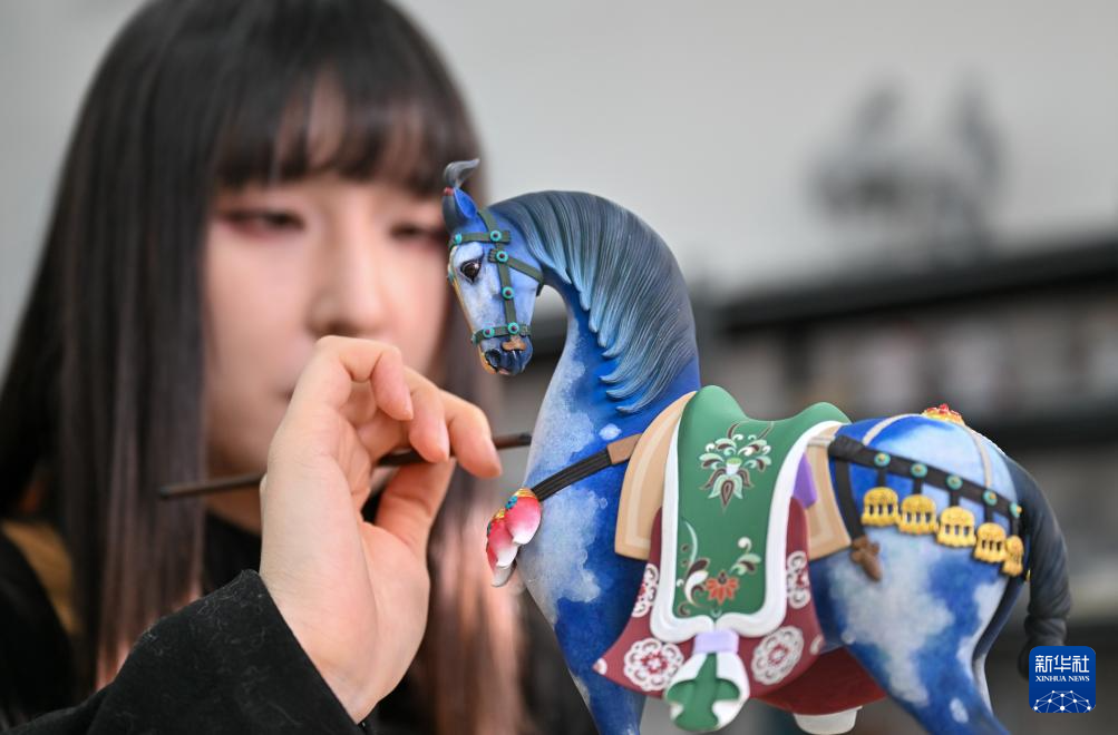 2月5日,在天津泥人張彩塑工作室,工藝美術師史庭瑄對作品《紺寶馬》進行彩繪。新華社記者 孫凡越 攝