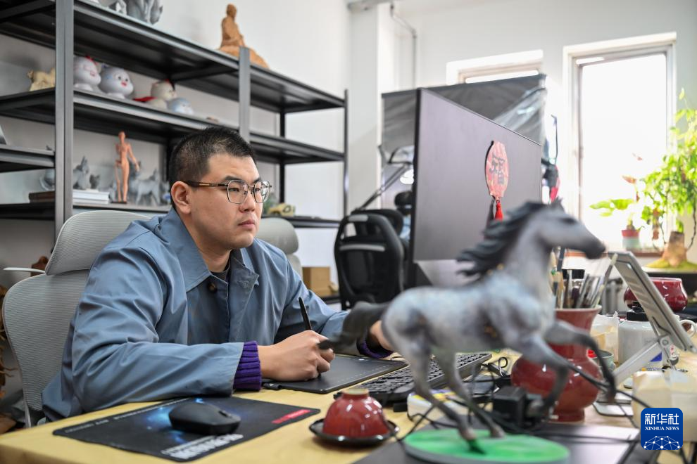 2月5日,在天津泥人張彩塑工作室,工藝美術師運用電子畫筆工具在電腦上進行作品創作。新華社記者 孫凡越 攝