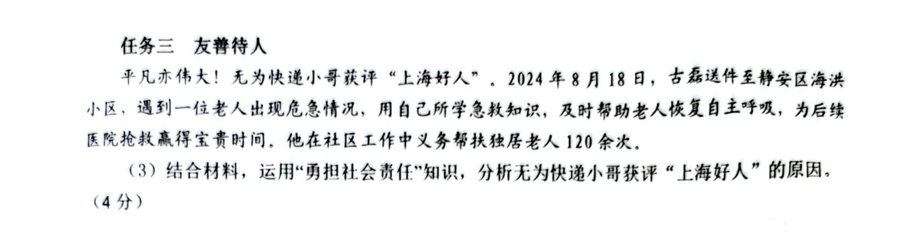 今年1月底,在蕪湖無為市劉渡中學八年級“道德與法治”期末考試中,古磊的女兒樂樂意外發現試卷題目上印著自己爸爸的名字——“平凡亦偉大!無為快遞小哥獲評‘上海好人’。古磊送件至靜安區海洪小區時,遇到一位老人出現危急情況,用自己所學急救知識,及時幫助老人恢復自主呼吸,為后續醫院搶救贏得寶貴時間。他在社區工作中義務幫扶獨居老人120余次。結合材料,運用‘勇擔社會責任’知識,分析無為快遞小哥獲評‘上海好人’的原因”。
