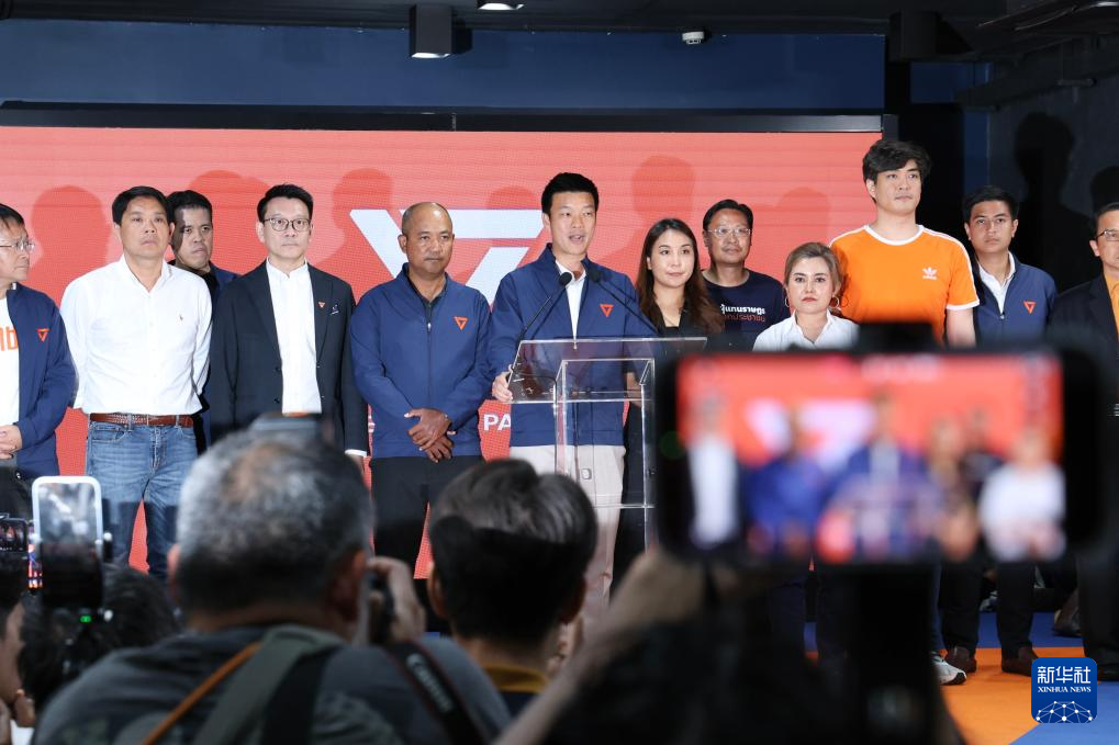 2月8日,在泰國首都曼谷,泰國人民黨黨首那塔蓬(中)參加新聞發布會。新華社記者 孫瑋彤 攝