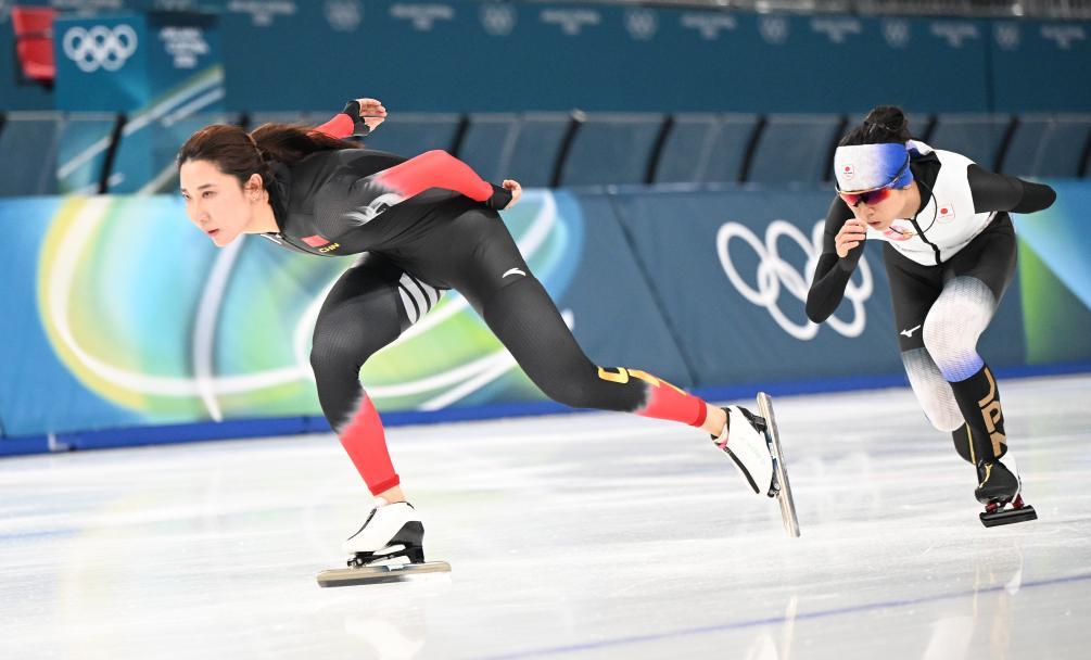 2月5日,中國運動員韓梅(左)和日本運動員高木美帆在訓練中。新華社記者 武巍 攝