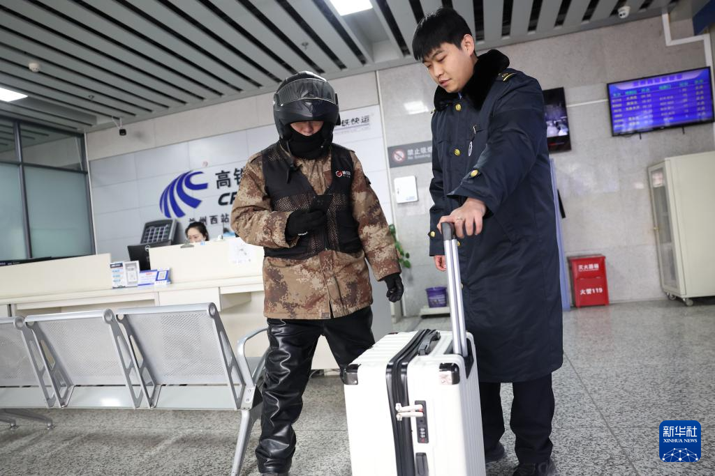 2月8日,中鐵快運(yùn)蘭州西站營業(yè)部工作人員雒鵬將一位旅客的行李送出車站。新華社記者 陳斌 攝