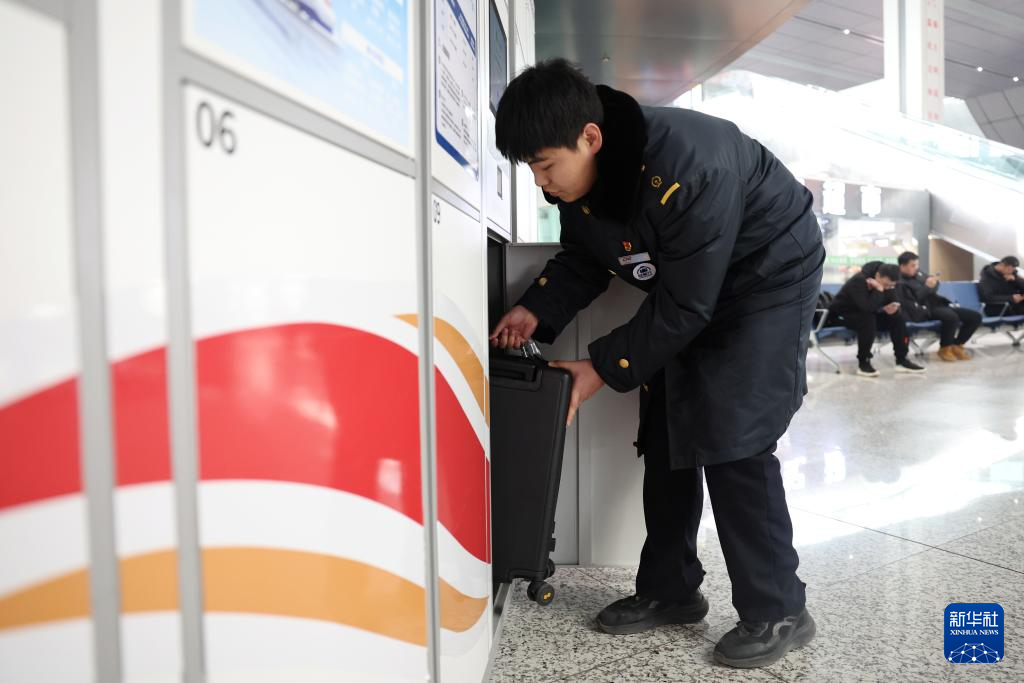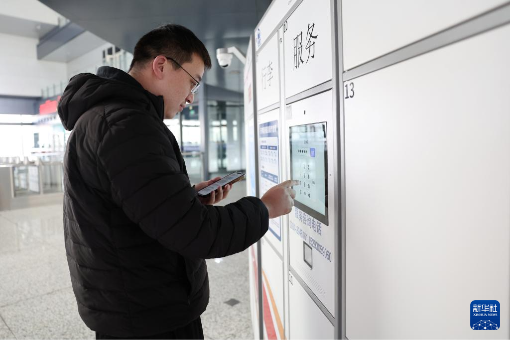 2月8日,中鐵快運(yùn)蘭州西站營業(yè)部工作人員雒鵬將接收的旅客行李放入候車廳的“輕裝行”自助服務(wù)柜里。新華社記者 陳斌 攝