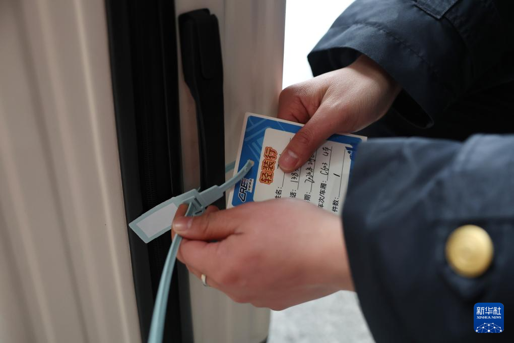 2月8日,中鐵快運(yùn)蘭州西站營業(yè)部工作人員雒鵬將“輕裝行”服務(wù)卡掛在旅客的行李上。新華社記者 陳斌 攝