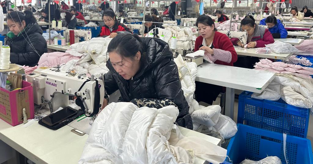 這家擁有200多名工人的服裝企業,位于甘肅省定西市通渭縣平襄鎮。企業負責人盧亞明介紹,為在春節前交付來自山東客戶的訂單,員工們正馬不停蹄地趕工?!皩嵭杏嫾べY制,多勞多得,大家干勁都很足?!北R亞明說。