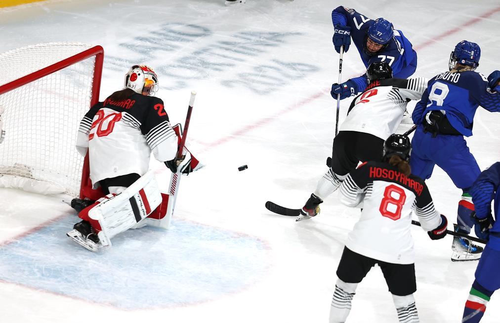 2月9日,意大利隊球員勞拉·福爾蒂諾(上)在比賽中射門。新華社記者 孟晨光 攝