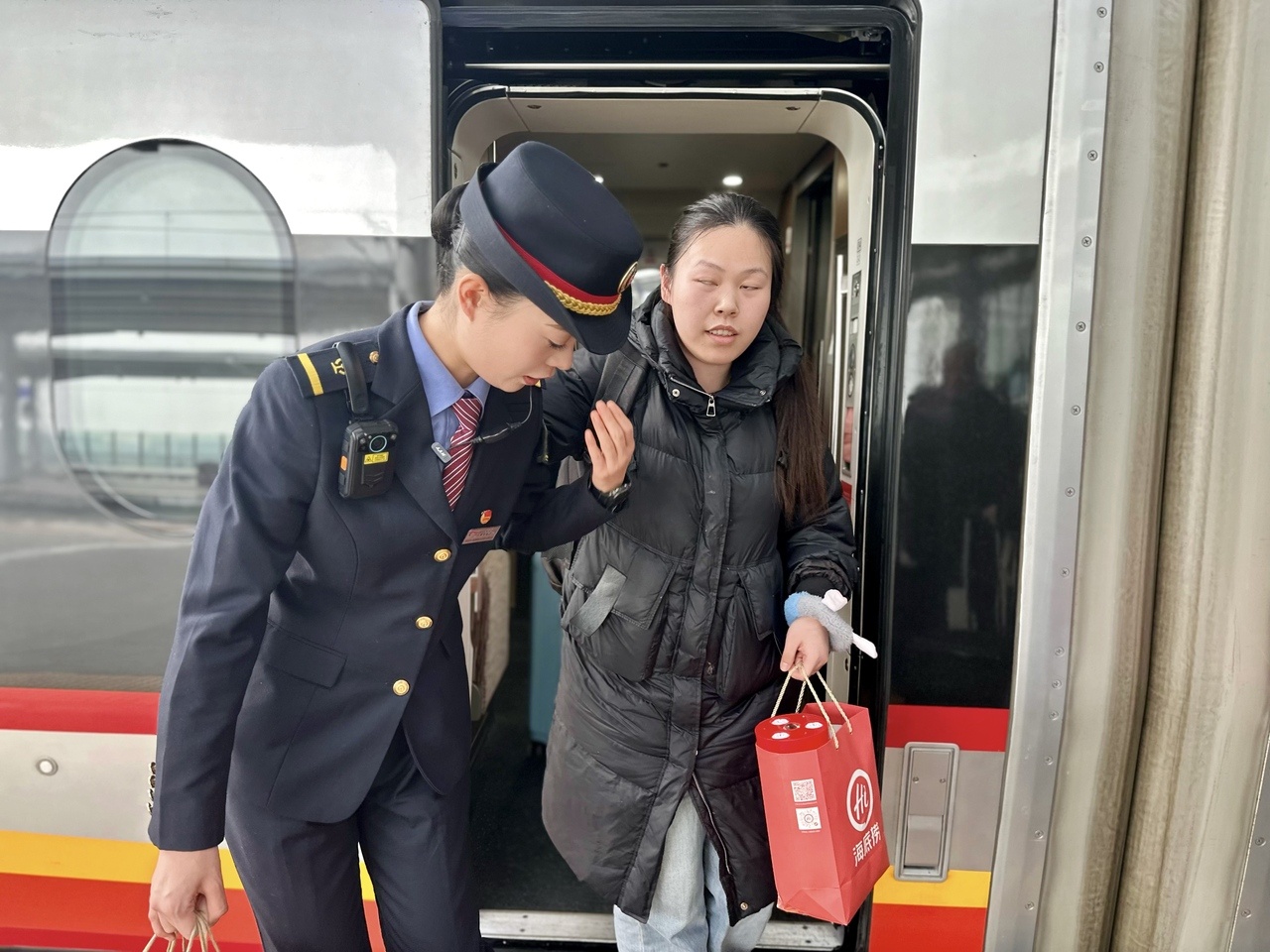 9時(shí)29分,泰安站。肖惠勻看到一名視障旅客在工作人員攙扶下緩慢走來,立即迎上接過行李。“我是列車長,為您指引。”她左手提包,右手呈弓狀牽引旅客,細(xì)心提示每一步。