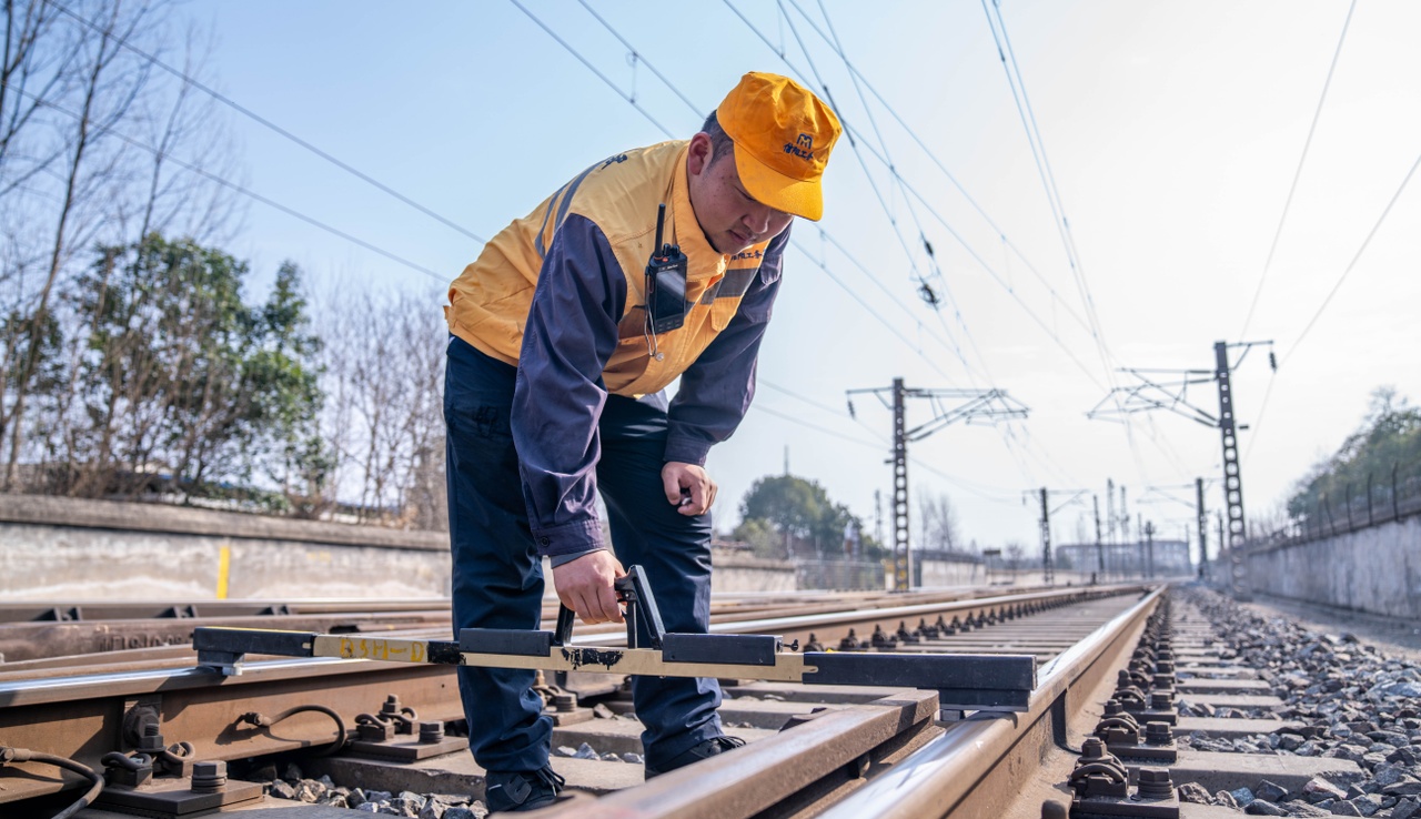 在維修作業現場,余仁龍手拿道尺,俯身鋼軌,仔細查看今天要處理的線路病害,“前面兩根枕木劃上標記,那里有高低病害。”余仁龍喊道。