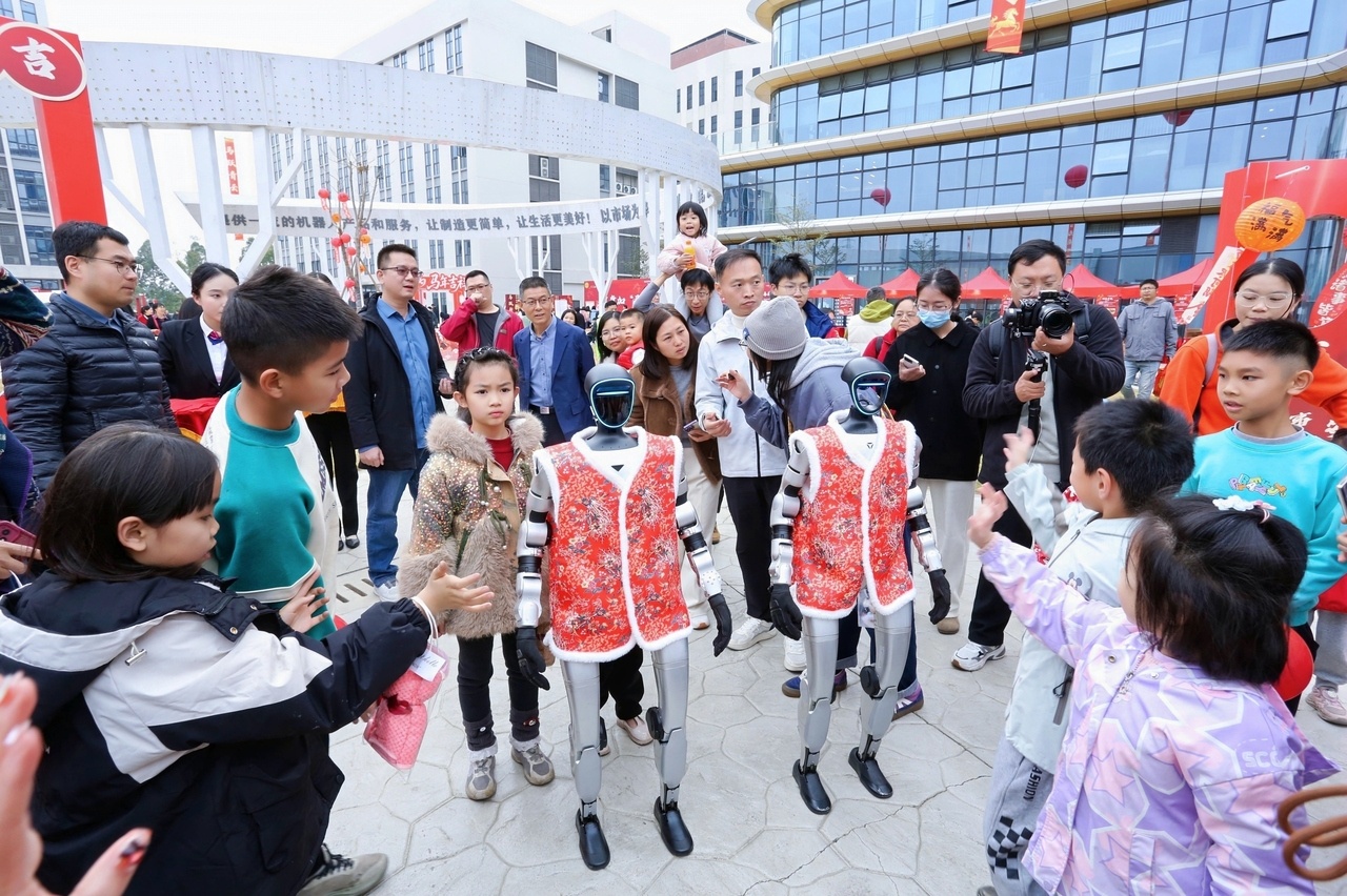 活動現場,兩臺身形靈巧的人形機器人穩穩遞出喜慶紅圍巾,將新春的暖意精準送到每位嘉賓與職工手中;另一臺智能機器人則與職工們來了一場跨越時空的奇妙對話,一旁的機械臂、無人機等,更引得現場職工紛紛駐足。更有機器人在晚會上與職工同臺獻舞,讓職工近距離感受科技帶來的生活變化。