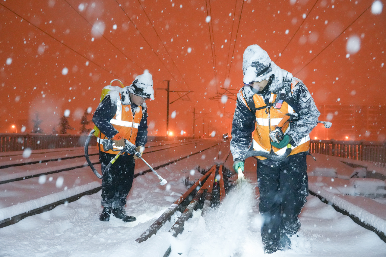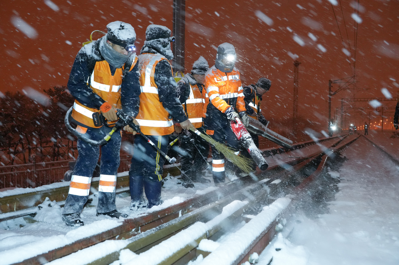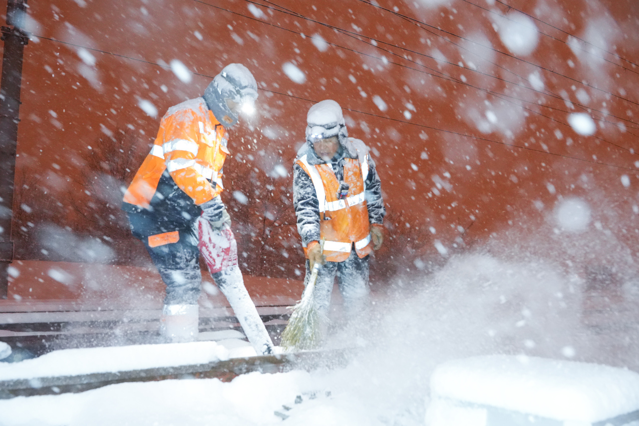 處置道岔積雪,本質上是與時間的賽跑。由于列車運行間隔較短,留給他們的作業窗口期僅有短短40分鐘。他們拿著1米長的吹雪機,扛著15公斤重的防凍液,手持除雪鏟與竹掃帚,在白茫茫的線路間快速穿梭。
