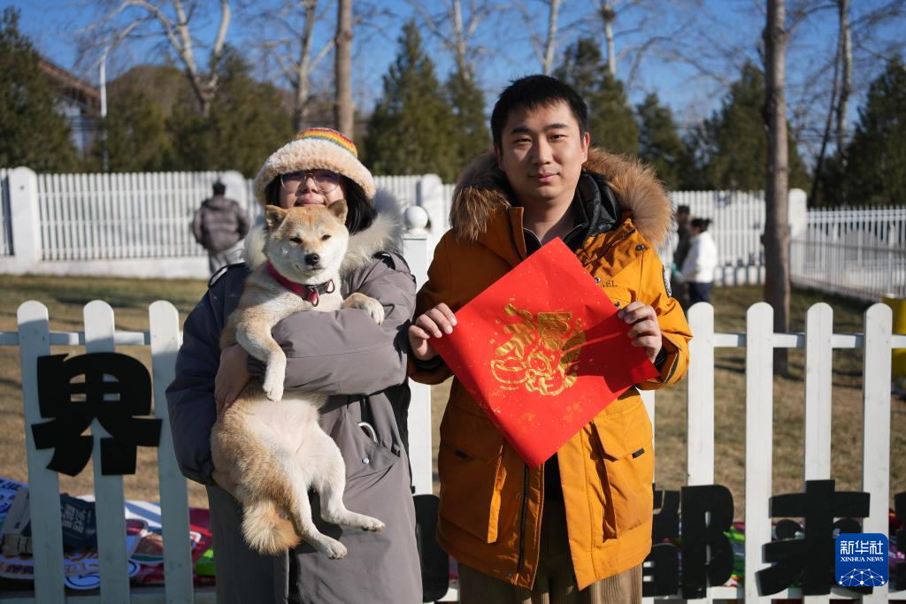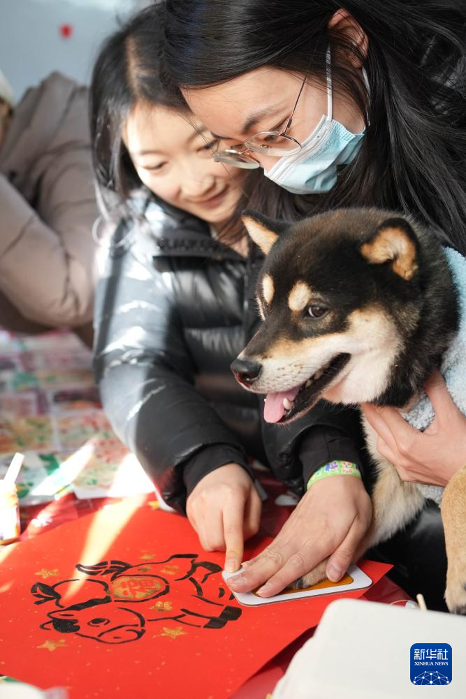 1月31日,在北京市昌平區舉行的一場寵物廟會上,寵物狗在福字上拓印爪印。新華社記者 謝晗 攝