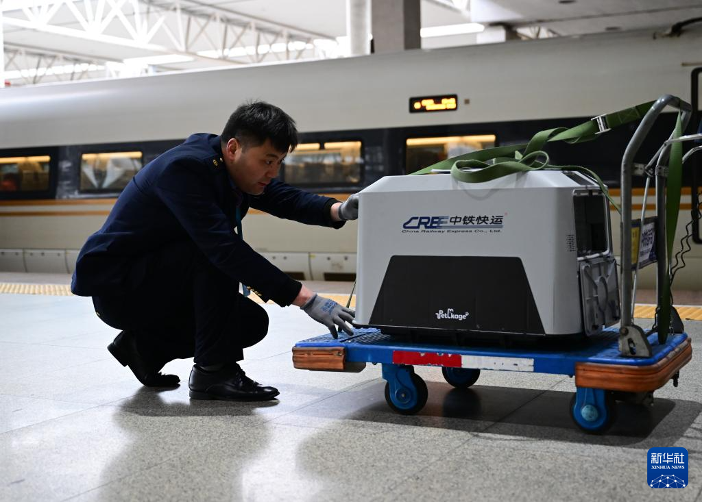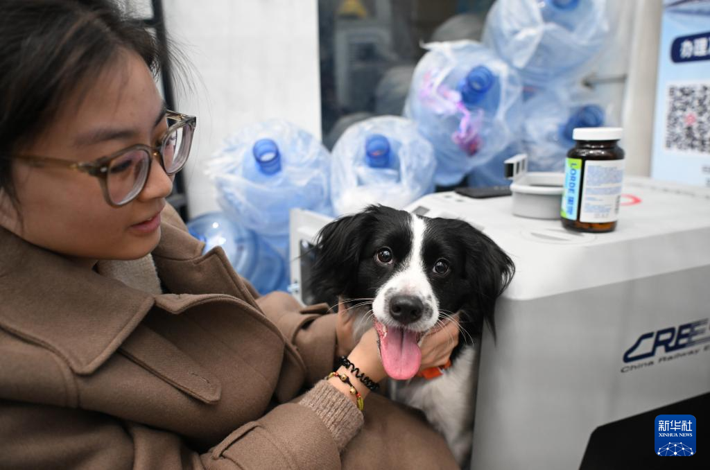 2月6日,在合肥南站站臺,工作人員在“高鐵寵物運輸箱”裝車前查看寵物狀態。新華社記者 周牧 攝