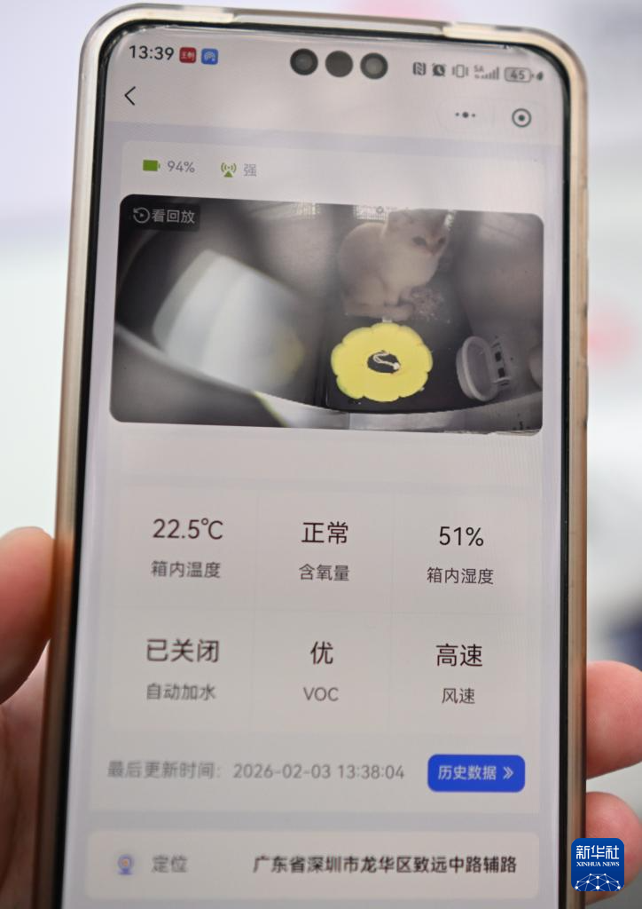 2月3日,在深圳北站中鐵快運營業部,工作人員展示寵物托運專用箱內的視頻畫面。新華社記者 鄧華 攝