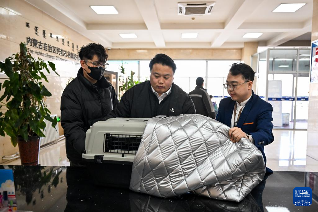 2月6日,在呼和浩特白塔國際機場,工作人員給待托運的寵物航空箱套上保溫棉,讓寵物在寒冷天氣中能夠舒適保溫。新華社記者 李志鵬 攝