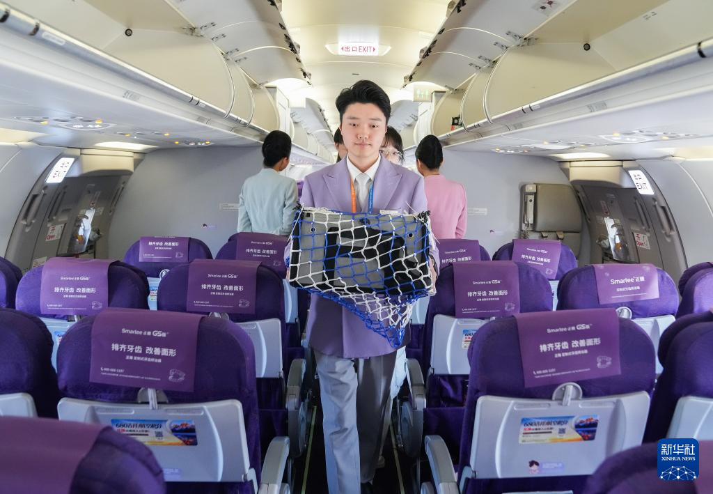 2月3日,在上海飛往成都的HO1059次航班上,吉祥航空工作人員將寵物貓“好好”搬進機艙。新華社記者 丁汀 攝
