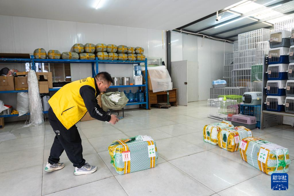1月31日,在云南省昆明市,空運出發前,一家寵物托運公司的工作人員為打包好的托運寵物拍照記錄,并同步給顧客。新華社記者 高詠薇 攝