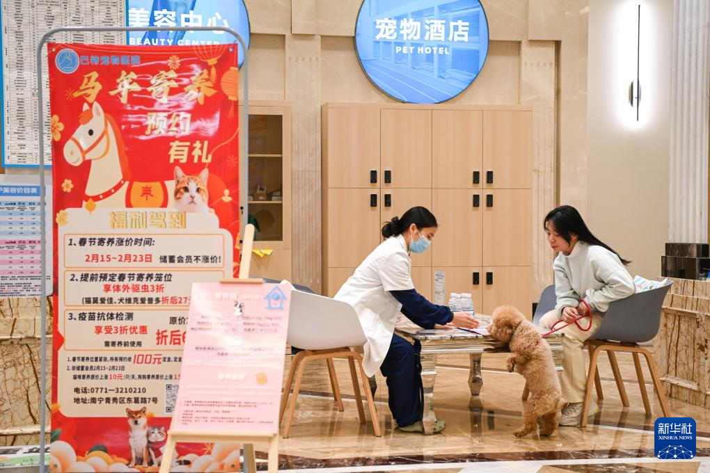 2月1日,在廣西南寧一家從事寵物寄養業務的寵物醫院,工作人員在登記寄養寵物的狀態。新華社記者 曹祎銘 攝