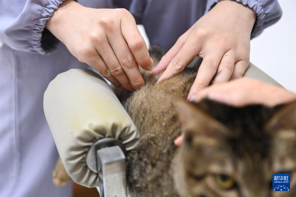 2月1日,在廣西南寧一家從事寵物寄養業務的寵物醫院,工作人員為貓針灸。新華社記者 曹祎銘 攝