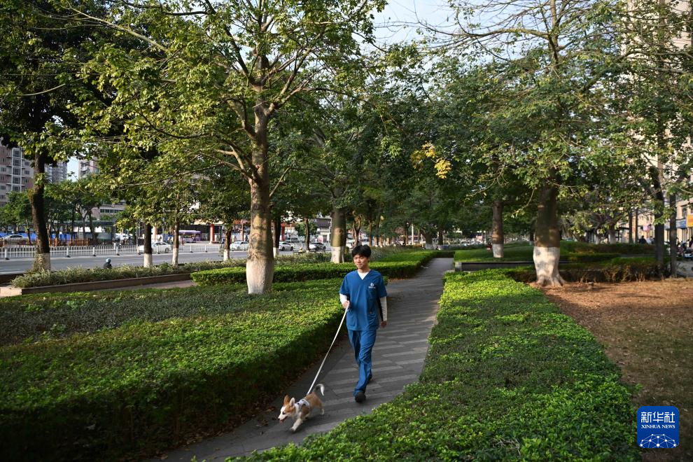 2月5日,在廣州市荔灣區白鶴洞街道,飛豬寵物醫院工作人員牽著寄養在此的寵物狗“屁屁”散步。飛豬寵物醫院春節期間提供寄養服務,他們負責給寄養寵物喂食、清潔、代遛。新華社記者鄧華 攝