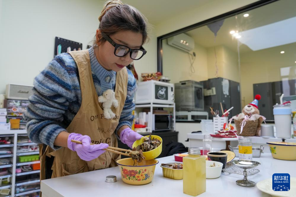 2月3日,在江蘇無錫,寵物烘焙師丁一凡在制作寵物年夜飯的樣品。新華社記者 李博 攝