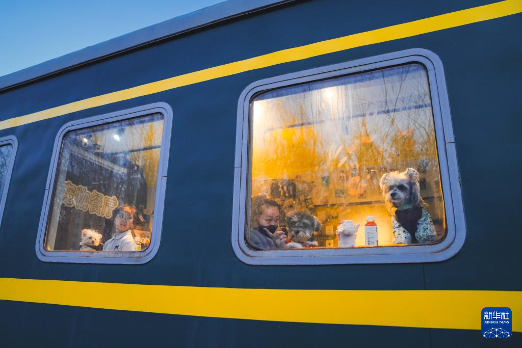 2月3日,在吉林省長春市一家火車車廂主題的寵物餐廳,幾只寵物狗坐在窗邊等待“寵物年夜飯”。新華社記者 許暢 攝